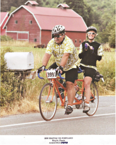 Jim started getting back into cycling in the early 90’s. Then I joined him. We lived in Vancouver (still do) but joined PWTC instead of the Vancouver club because Jim was a printer and printed PWTC’s Rider’s Digest and Quick Releases. He was intrigued by all the rides, and we started riding with the club. That is to say, we showed up at the start, often with our friend Hannah, and quickly got dropped. But the three of us had a great time doing the rides!