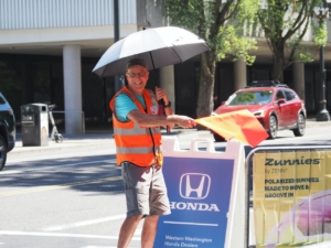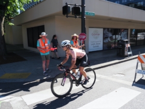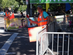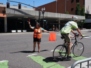 There are two main functions of the safety team: keeping everyone safe at the intersection of NE Multnomah Street & NE 11th Avenue, and keeping everyone safe through the finish line chute into the park. At the intersection, there is a traffic signal, and you will have a STOP/SLOW sign and will remind riders that they need to stop when the light is red; likewise, spectators must wait for the crosswalk light and not step in front of approaching cyclists. You will not be involved with cars because NE 11th Avenue is closed for STP, so the only cars will be going east/west independently. In the chute, you will encounter riders who are so anxious to be done that they’ll be coming in fast, and they will need you to tell them (verbally and/or using hand motions) to slow down. Other riders will be so anxious to dismount or greet awaiting spectators that they’ll slow down or stop, and they will need you to point out that there are riders behind them continuing to roll in, and to direct them to proceed out of the chute into the park to prevent a traffic jam. ✎