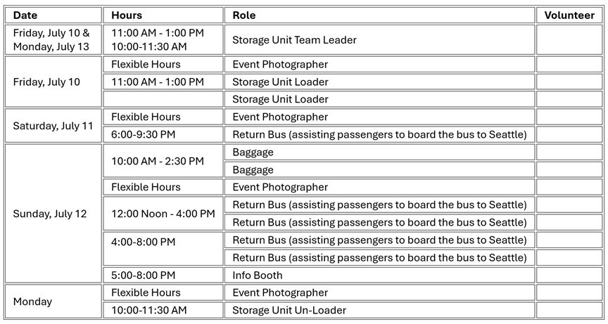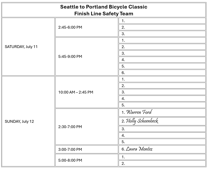 If you’d like to volunteer on the safety team but these pre-defined shifts don’t work for you, please let me know the hours you’d like to work, and I’ll customize a shift for you. You can sign up online at 2026 Seattle to Portland Finish Line, or contact me at [email protected] and I’ll sign you up. Below is the big-picture view for safety. Team Leader Kurt Minges is also still looking for a co-leader.