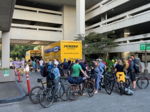 PBC volunteers welcome all finishers to Portland with our emcees cheering their arrival. We unload and organize riders’ baggage by number, and help riders find and retrieve their belongings. We set up and staff the secure bike corral.