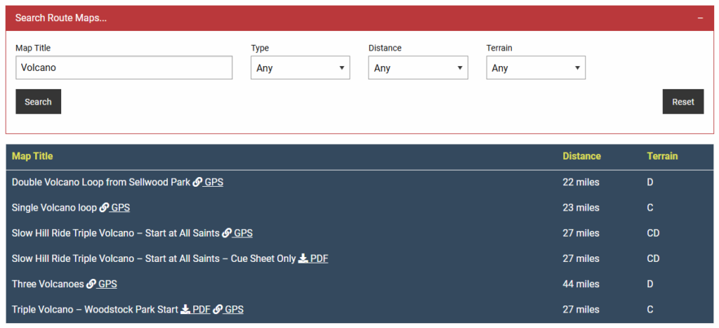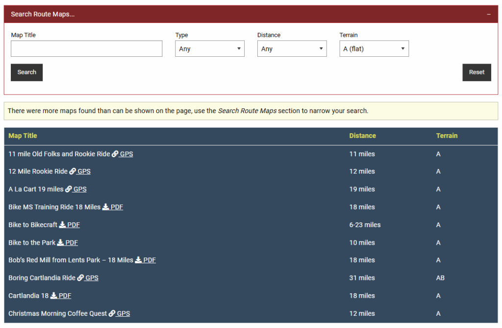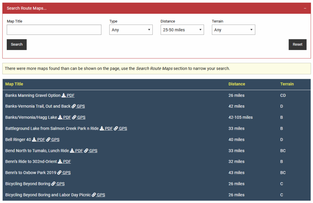 Log in to the PBC website and check it out at https://portlandbicyclingclub.com/maplibrary/. Enter a search: word, distance, or terrain; and find a ride. ✎