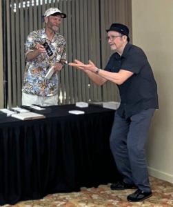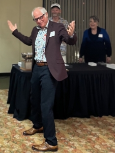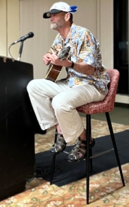 Doug Myers was our master of ceremonies, decked out in an island-themed shirt, light pants, sandals, and a cap with blue parrot feathers. Doug set the mood with his guitar solo featuring two Jimmy Buffet hits replaced with clever PBC lyrics he had composed, such as the line “Wastin’ away in Mileage Creditville.”