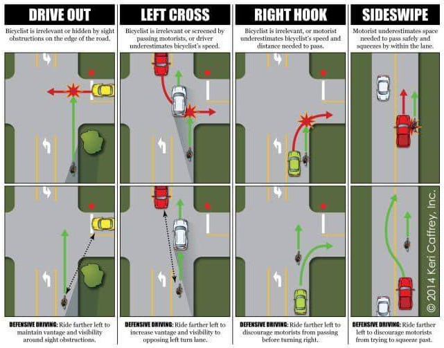 A car passes you and then tries to make a right turn directly in front of you, or turns right into you. They may think you’re not going very fast just because you’re on a bicycle, so it never occurs to them that they can’t pass you in time. Even if you have to slam on your brakes to avoid hitting them, they often won’t feel they’ve done anything wrong. This kind of collision is very hard to avoid because you typically don’t see it until the last second, and because there’s nowhere for you to go when it happens.