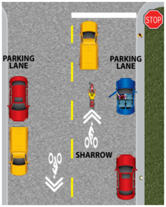 Where you choose to position yourself on the road depends on the street you’re on and the conditions of the roadway. In Oregon, if there is a bicycle lane on a street you are required to ride in it, with exceptions. When there is no bicycle lane, it is generally best to ride on the right. If there is no bicycle lane or shoulder and the vehicle travel lane is narrow, you should ride closer to the center of the traffic lane. On some streets a shared lane marking or “sharrow” is painted on the road to indicate that the lane is shared with people driving and people riding bicycles. Position yourself over the sharrow to make yourself more visible to drivers. Remember, ride to the left or take the lane when approaching intersections to avoid the right hook, checking your mirror first, of course, before you move left.