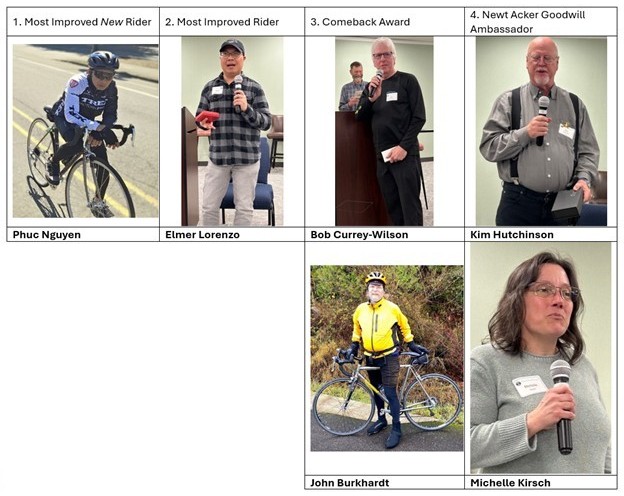 The annual Portland Bicycling Club awards banquet was held on Thursday, February 5, at the recently renovated Monarch ballroom under the new ownership of the Hilton Garden Inn. The revamped setup was large, with plenty of room to accommodate nearly 100 guests. Our newly elected club president, Doug Myers, once again acted as master of ceremonies, with his usual charm, wit, and musical talent. Doug strummed along on his guitar to his original penned lyrics of “The Ballad of the Wreck of the Trail Gresham-Fairview” to the tune of “The Wreck of the Edmund Fitzgerald.”