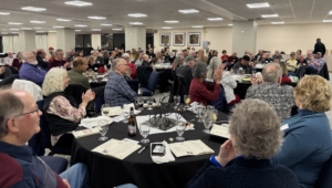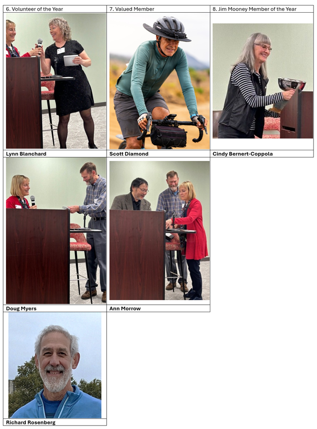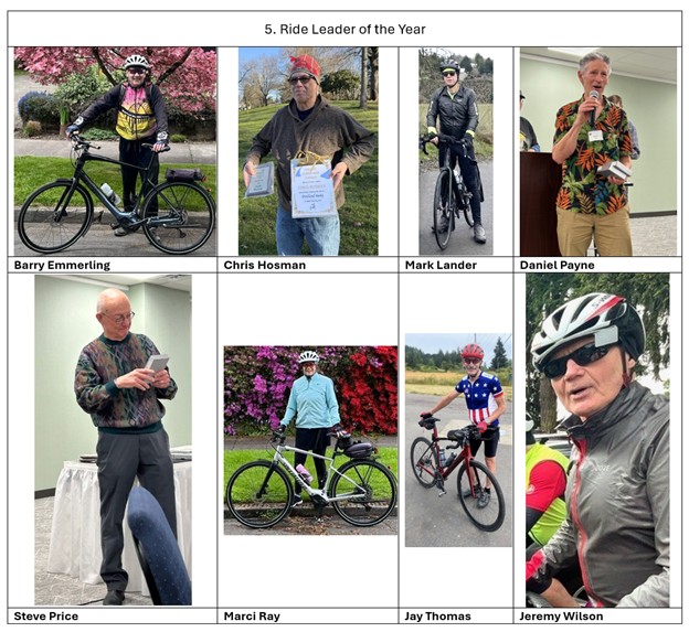 There were 47 coffee mugs ready to be picked up, representing members with 2,000 or more club miles in 2025, along with club pins for 500 miles or more, and club socks with the PBC logo for ride leaders. Ride leaders who led 12 or more rides also earned a $25 Starbucks gift card. (Note: If you didn’t make it to the banquet, see Bud Rice on one of his rides to collect your loot.) Twenty-three lifetime cumulative mileage plaques were awarded, ranging from the first 10,000 miles to the 310,000-mile plaque for Dick Weber. ✎