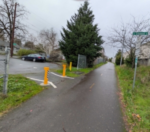 Ask for update. On January 9, 2026, I thanked Mr. Creager for the September 23 update on bollard safety, and enclosed photos of bollard markings along the I-205 bike path. “I took them near SE Glenwood St. adjacent to a residential area. Those bollards are highly visible. The bollards are painted yellow, with striped reflective decals. Pavements next to the bollards are painted with thick white stripes. Just south of SE Glenwood, a “TRAIL X-ING AHEAD” sign warns of an at-grade street crossing (though the sign is partially obscured by branches).”