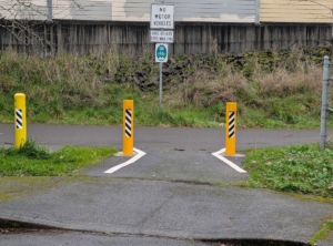 “Beware unmarked raised bollard holders that extend above grade! I discovered that at PGE’s driveway to St. Mary’s substation (1785 SW 158th). Two sets of fixed bollards are properly painted in yellow. But the center bollard holders extend 2 or 3 inches above grade AND ARE NOT SAFETY-PAINTED. With shade, those holders are not visible.” On September 23, Mr. Creager reported that a staff member investigated the site, and reported that sometimes other parties (contractors?) fail to reattach bollards after completing a maintenance task (like mowing adjacent grass). Creager’s team is “reviewing our Trails Functional Plan, which includes specs such as details on bollards.” Options may include “…removing some bollards or marking the perimeter of the bollard sleeve for those instances when staff have the bollards removed. Looks like that will be an approved option, so something we are researching now in terms of what is the best product- paint, meltable strip, etc.”