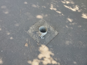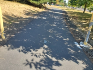 On August 5, I reported the hazard to a PGE service coordinator (503-323-6700). I asked that PGE either clearly paint around the raised bollard receptacles or better yet reset the bollard holders to flush with grade. It turns out that the bollards in question are property of Tualatin Hills Park and Recreation District, not PGE. THPRD’s Nature & Trails Supervisor, Greg Creager, is looking into the best way to mark the raised bollard receptacles. I will keep you informed of THPRD’s response.